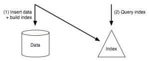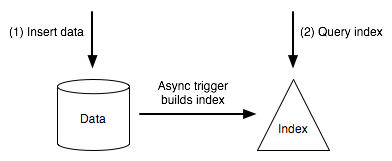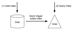 In Figure 2 a write to the database (Step 1) will return as soon as the write is finished. An Asynch trigger is scheduled to update the index. This trigger will run some time after the response to the client. This also means that for a short period of time, the data and the index will be out of sync (i.e. inconsistent). A query to the index (Step 2) might now always see the latest results. We believe that this is acceptable for many web applications. For example in Twitter it is totally fine if a search ignores tweets that have been posted less than a second ago.