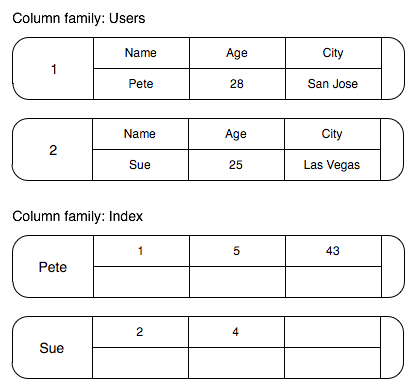 Here is a concrete example of how to index a user database not only by user id, but also by name (a secondary index). Figure 3 shows a possible layout of column families in Cassandra. The first column family “Users” stores data about users. Each row is naturally indexed by its row key (in our case it is the user id). The second column family “Index” stores redundant data to quickly retrieve users by their name. For example if you want to look up the name “Sue”, you will find two users with ids 2 and 4.