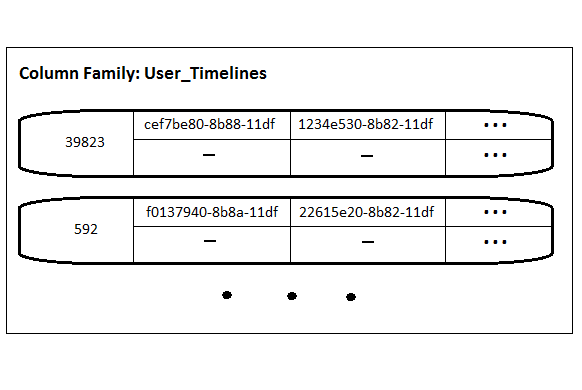 Column family Tweetscontains records representing tweets. The key of a record is of Time UUID type and generated when the tweet is received (we will use this feature in User_Timelines column family below). The records consist of columns (no super columns here). Columns simply represent attributes of tweets. So it is very similar to how one would store it in a relational database.