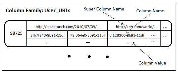 To demonstrate super columns let us assume that we want to collect statistics about URLs posted by each user. For that we need to group all the tweets posted by a user by URLs contained in the tweets. It can be stored using super columns as follows.