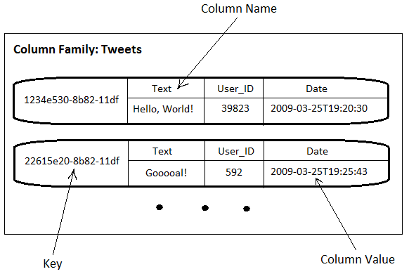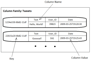 A database consists of column families. A column family is a set of key-value pairs. I know the terminology is confusing but so far it is just basic key-value model. Drawing an analogy with relational databases, you can think about column family as table and a key-value pair as a record in a table.
